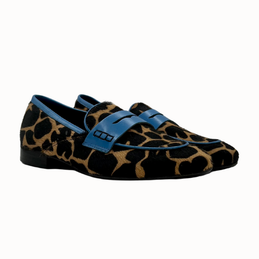 Mocassino in cavallino stampa giraffa e profili azzurri