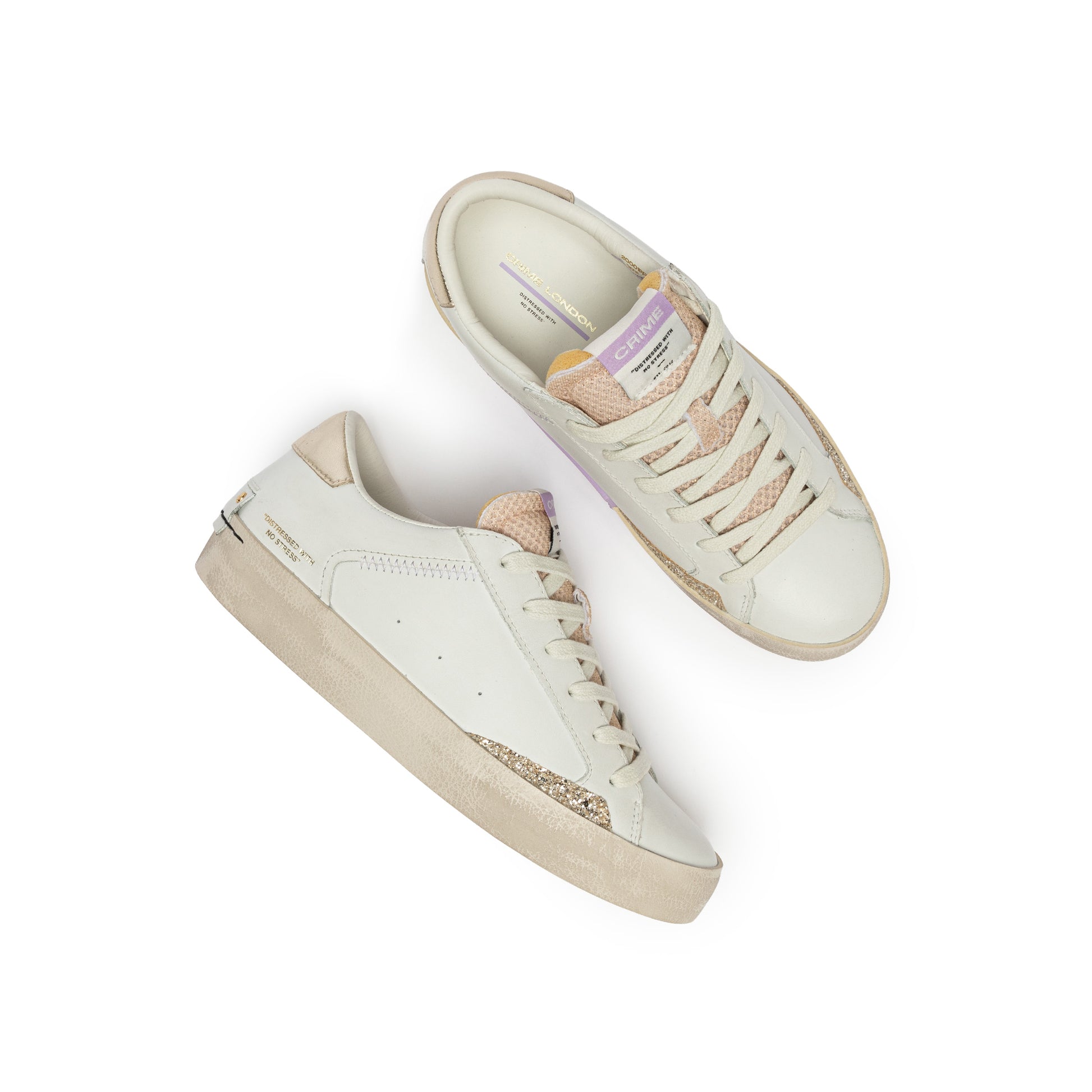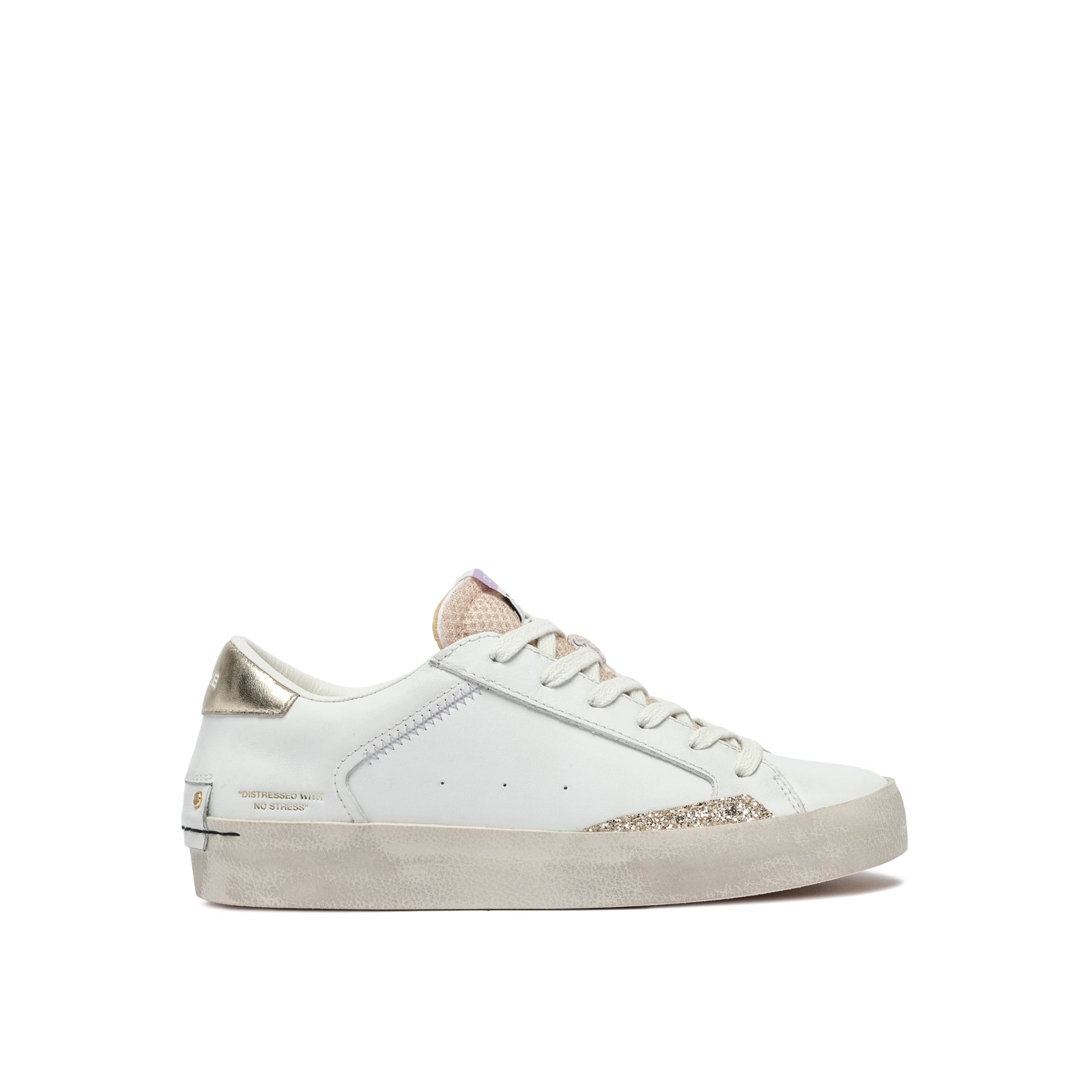 Tomaia in pelle bianca con borchie a stella, dettagli in glitter platino