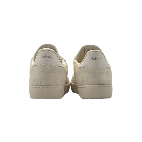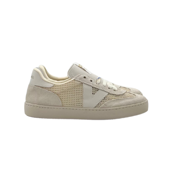 Scarpe per donna realizzate in Spagna in tessuto tipo mesh con dettagli in camoscio tono su tono. V laterale di victoria e dettaglio posteriore bianchi a contrasto. Chiusura con doppio laccio: uno bianco e l'altro con stampa tono su tono. Suola in PVC leggermente ambrata realizzata con oli vegetali anziché minerali, riducendo così l'impatto ambientale.